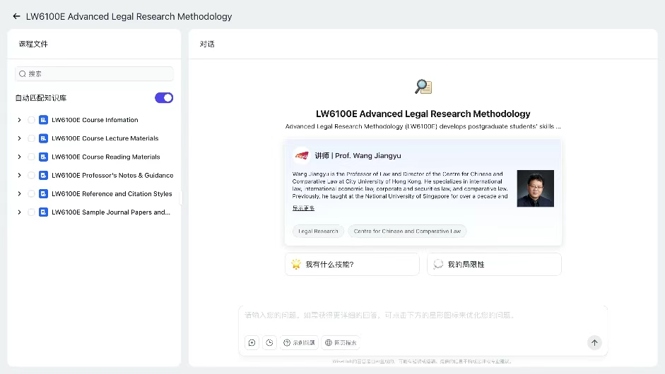 在这一背景下,香港城市大学近日上线了全港首个深度融入课程体系的人工智能助教“AI-Tutor Agent”。该系统由WiseLaw Digital Technology团队联合校内法学教授共同研发,不以外部辅助工具的形式存在,而是直接参与课程全流程,承担课堂答疑、知识溯源与思维引导等功能,被纳入正式教学结构。这一应用表明,人工智能技术正从教学外围走向教学核心,以课堂参与者的身份进入高等教育。